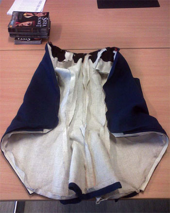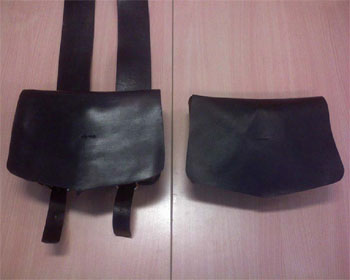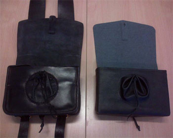 (H�r �r ett exempel p� tv� bantl�rtaskor; till h�ger �r en exakt replika efter orginalet i riktigt l�der och till v�nster en betydligt enklare replika i skye-material som Jonas sytt upp)