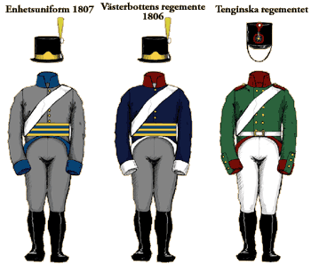 Västerbottens regemente hade fram till inf�randet av enhetsuniformen 1807 en m�rkbl� färg, med r�d krage och vita uppvik vid ärmar och sk�rt. Br�strev�ret som 1802 ut�kats till att n� ända upp till axels�mmen togs helt bort och ersattes 1806 med tv� knapprader f�r att sedan �ndras till en knapprad. Under v�ren 1806 best�mdes genom ett kungligt brev att p� grund av de vita underkl�dernas ol�mplighet i f�lt skulle de ers�ttas med gr� l�ngbyxor och svarta st�vletter som slutade n�got nedom kn�et. H�sten 1806 best�mdes genom ytterligare ett kungligt brev att �vä jackorna skulle g�ras i gr� f�rg, vilket d� f�ranledde den helgr� enhetsuniformen 1807.